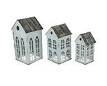 Here is a set of 3 rustic house sitters or candle covers, these are open on the bottoms and made of metal and have a distressed chippy whitewash finish over metal and have metal roofs with rust and gray on them, are made this way to look aged, they each have cutout windows around them and eack are different sizes, the Large measures - 11.75 Inches High, 6.25 Inches Long, 6 Inches Wide. Medium - 10 Inches High, 5.5 Inches Long, 5.25 Inches Wide. Small - 8 Inches High, 4.25 Inches Long, 4 Inches Wide, these are made of durable metal and very nice set of decorative houses, would look nice sitting over top of a candle or battery candle or just sit for decorative pieces. And these will ship nested together.