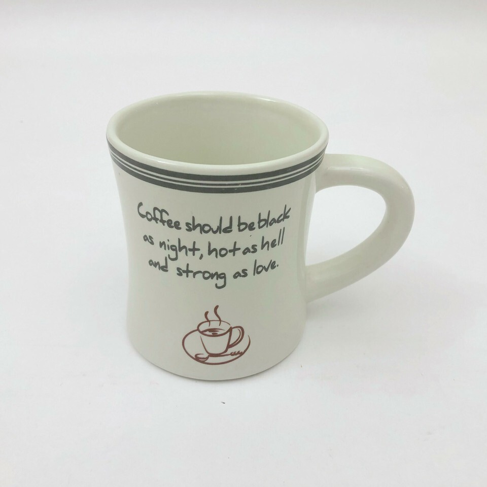 EUC, Excellent Used Condition. Those who love there coffee straight. "Coffee should be black as night, hot as hell and strong as love" printed on your perfect coffee mug. Holds 12 to 14 ounces of right out of the pot hot coffee. No cracks chips or stains.