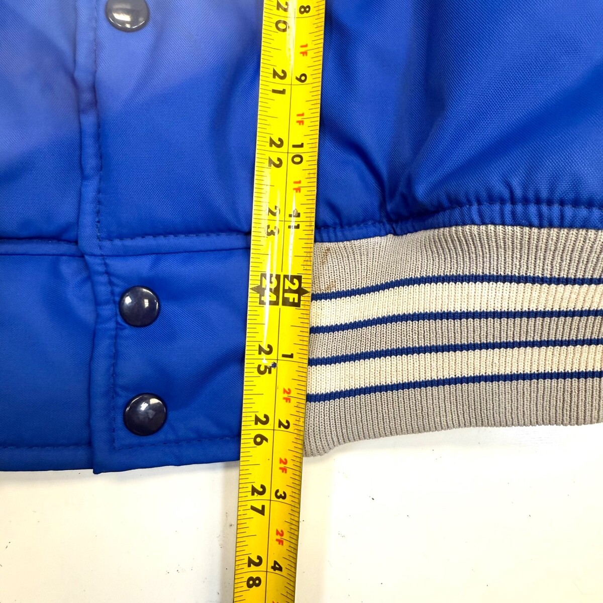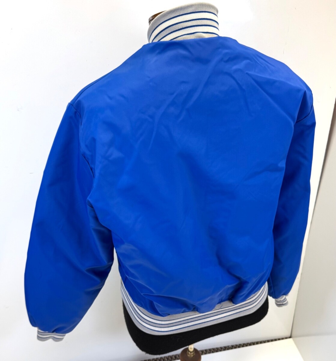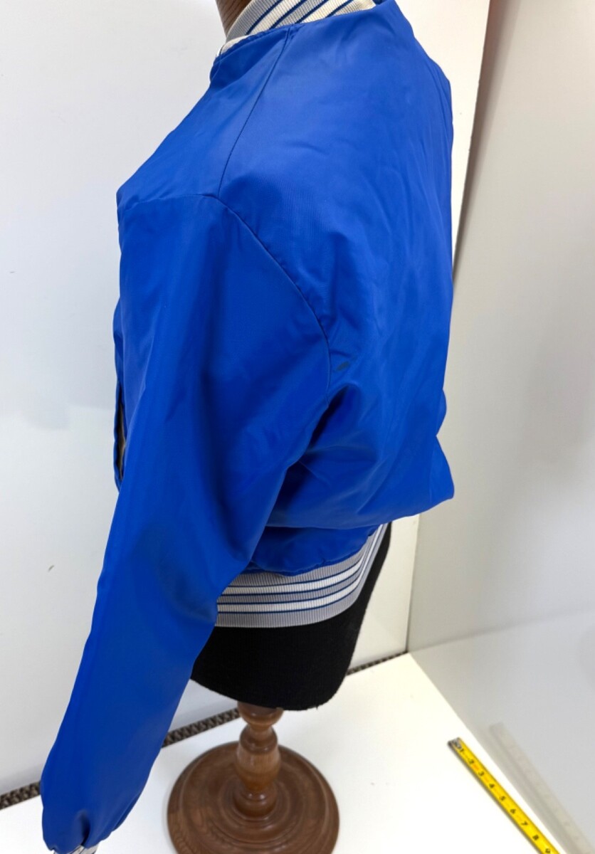 Howe Apparel Satin Bomber Jacket Blue Nightawks Emblem Size L Made USA VTG. Overall, good condition. Does show some minor wear, including some dark spots on the sleeves that are kind a hard to notice. Please see all photos. Photos include measurements for armpit to armpit and for top of shoulder to bottom of jacket.
