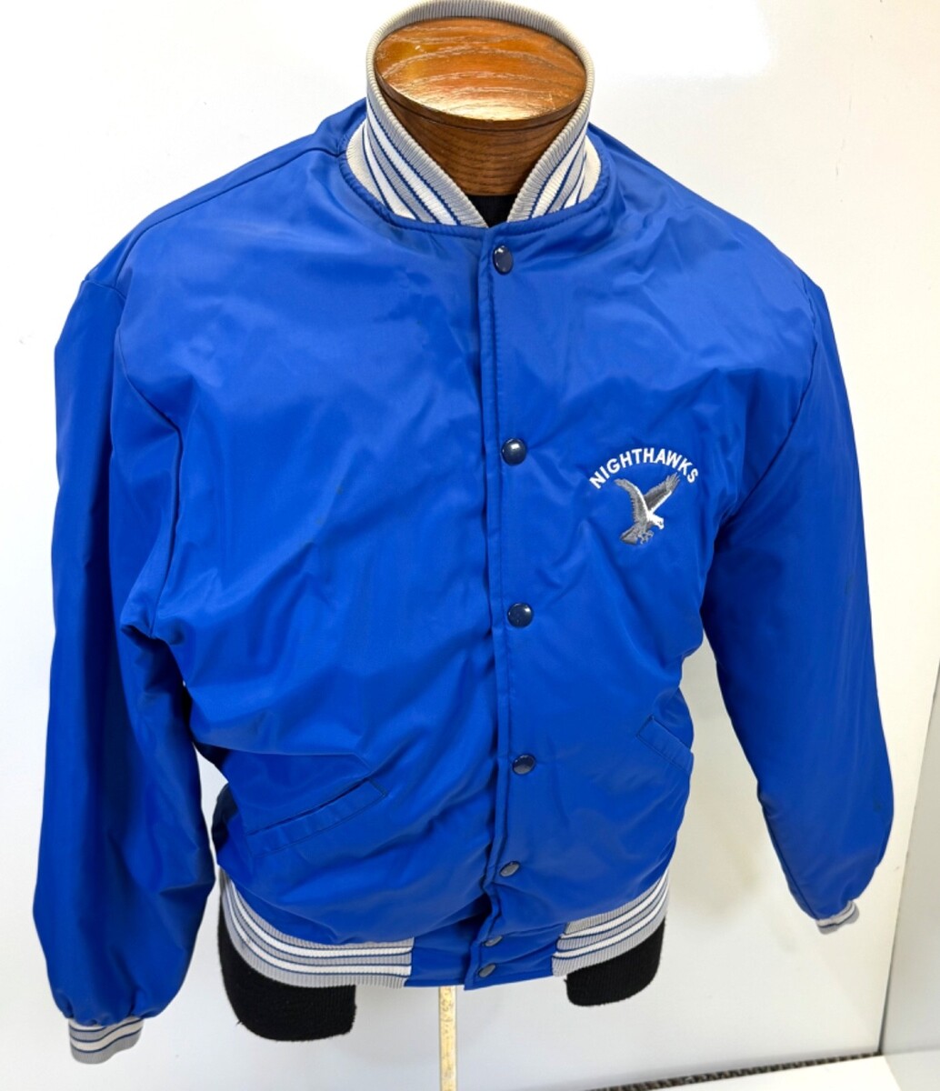 Howe Apparel Satin Bomber Jacket Blue Nightawks Emblem Size L Made USA VTG
