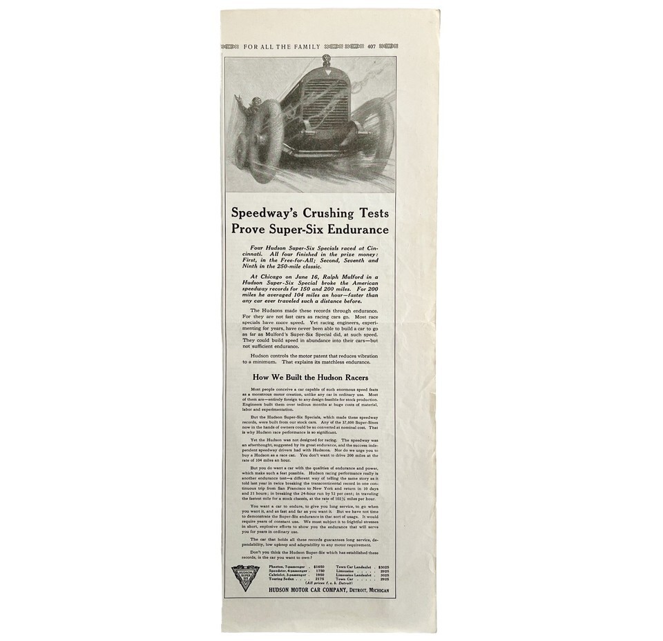 - Hudson Motor Co Speedway Super Six Tests 1917 Advertisement Automobilia DWII7