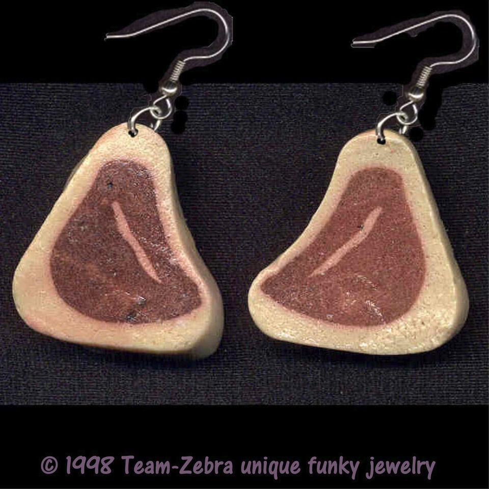 - Huge T-Bone STEAK Funky EARRINGS Chef Meat BBQ Picnic Food Weird Novelty Jewelry