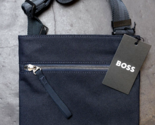 An envelop sling shoulder bag with bold BOSS logo on the front. The thin and easy-to-use size offers innovative designs that fit a wide variety of lifestyles, from suits to casual to sportswear. Front zippered accessory compartment, main zipper closure with interior divider. The length of the shoulder strap is adjustable. Max. strap length: 54". ? Color: Navy Blue ? Size (Approx.): 8.5" x 8.75" x 0.8" (21.5cm x 22.5cm x 2.0 cm).
