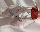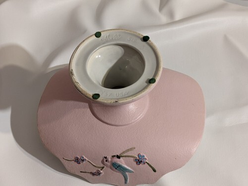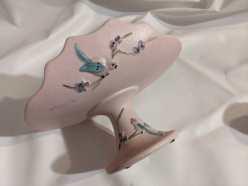 In vendita c'e un supporto per ciotola di frutta curvo con piedistallo rosa vintage Hull Pottery 515 Serenade Songbirds usato.