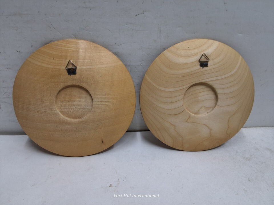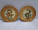 Hummel decorated wooden plates. Boy with umbrella, and boy playing violin. 6 in in diameter.