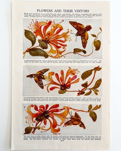- Humming Hawk Moth Honeysuckle Blossom 1940s Lithograph Print Art DWT7