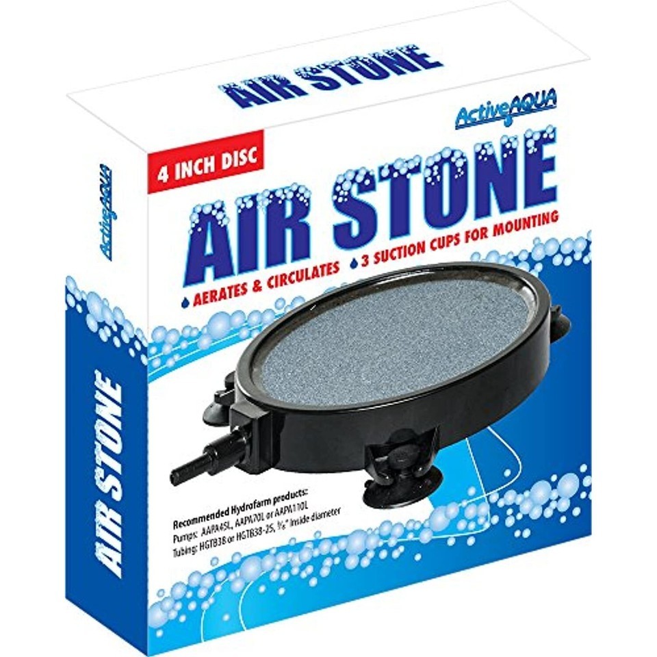 This active aqua 4-inch air stone disc is a great way to add oxygen to your hydroponic growing system. The micro-pore design energizes your growing solution as it aerates and circulates your nutrients. It will extend the life of your nutrient solutions, help keep your roots healthy and promote exceptional growth. This product weighs 0.5-pound. Measures 6-4/5-inch length by 4-4/5-inch width by 1-inch height.