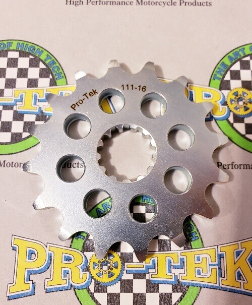 Pro-tek front sprockets are also completely CNC machined to exact tolerances from 4140 nickel-chromoly steel resulting in a quality product. None of the Pro-tek front sprockets are gear hobbed, but are lightened with drilled holes to save on rotating mass. Every lb of rotating mass equates to a 4 lb weight reduction. The sprockets are then case hardened to Rc 58-60 and finished with a zinc plating for added durability and protection from corrosion. Made in the USA, normally retail for $29.95. This is for a 525 Pitch front sprocket 13, 14, 15, 16 or 17 tooth.