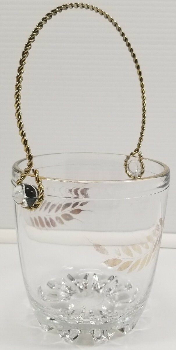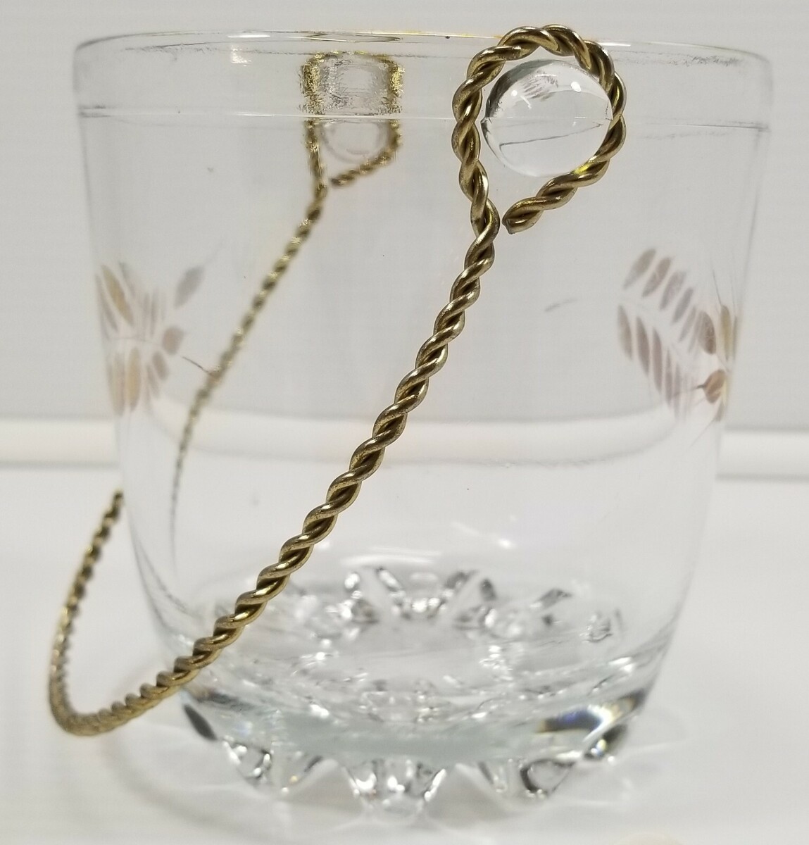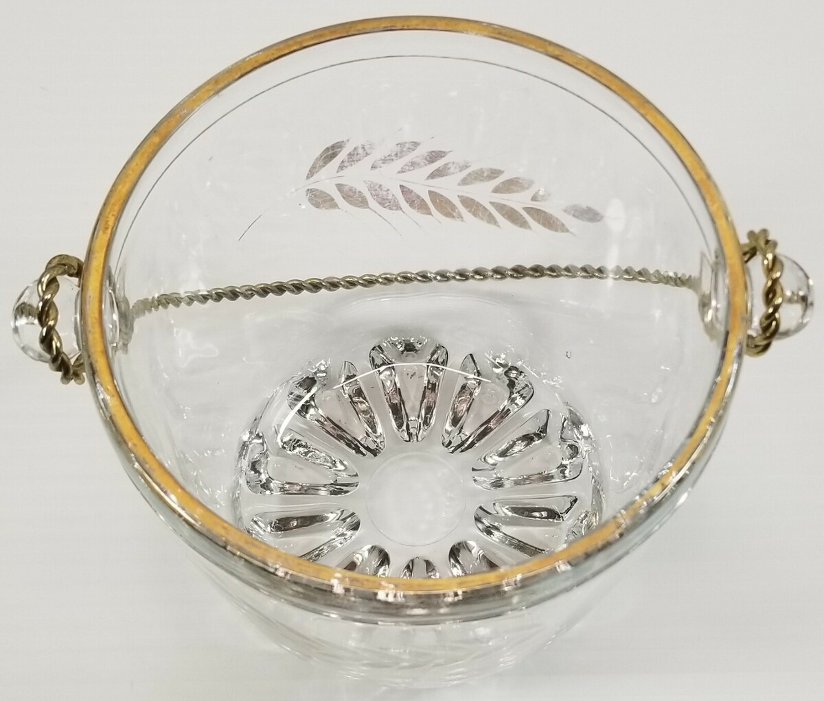 - I) Gold Tone Glass Ice Bucket with Gold Braided Rope Handle Floral Leaf Design