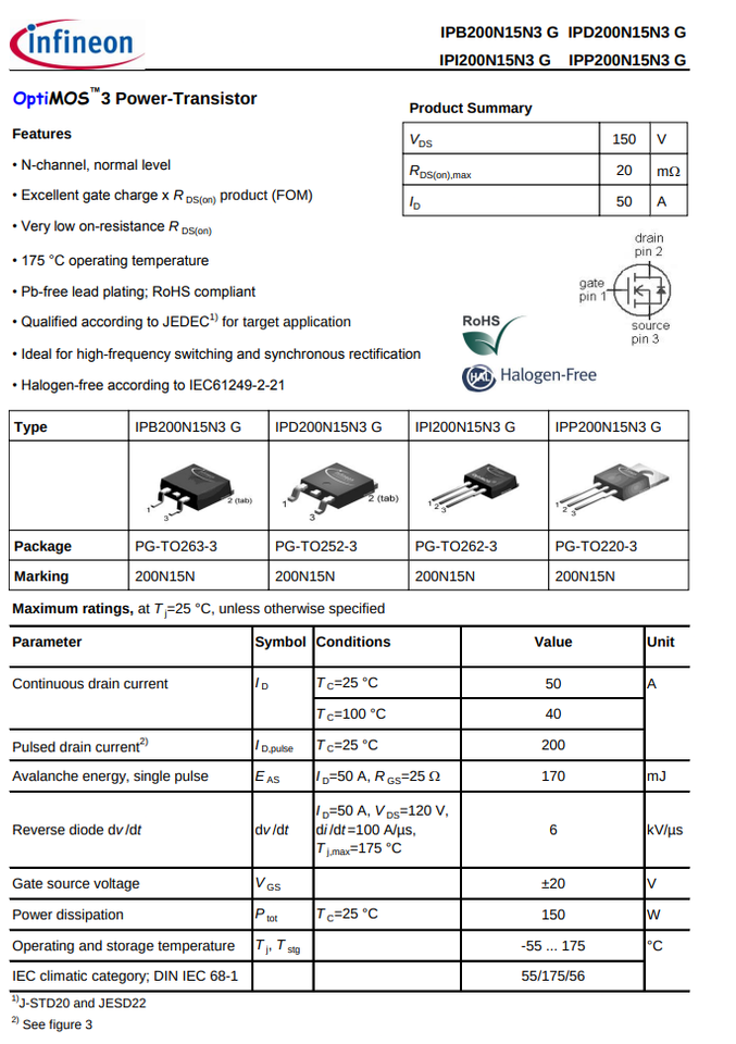 - IPP200N15N3G 200N15N Infineon Power MOSFET 150V 50A 20mΩ 150W TO-220