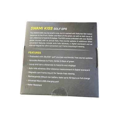 New in box IZZO Swami Kiss Golf GPS. This device comes preloaded with over 38,000 courses and features a magnetic cart mount for convenient, hands-free viewing. It is powered by a long-lasting battery that provides ample playtime. Ideal for improving your golf game or as a gift for the avid golfer, this GPS device would be perfectly suited for use on the golf course, during practice sessions, or while exploring new courses.