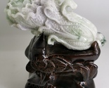 This is a precious jadeite jade ornament from Myanmar, crafted from a natural Burmese jadeite of the rare Icy Ice Multi Color variety. Meticulously carved from the finest Icy Ice Multi Color jadeite, this exquisite ornament showcases intricate craftsmanship and delicate details. Its design features a beautiful jadeite jade cabbage ornament, accompanied by a wooden base. The craftsmanship of this jadeite cabbage ornament is exceptionally refined, displaying a fusion of multiple colors achieved through masterful techniques. In Chinese culture, the cabbage symbolizes "hundred wealth," representing the accumulation of fortune and the arrival of good luck. This piece is a truly rare collector's item, as there is only one available. It embodies the fusion of artistic carving and precious gemstone, creating a testament to the pinnacle of craftsmanship. The approximate dimensions of the ornament are 119.00mm x 54.80mm x 42.20mm, with a weight of around 300 grams and a total carat weight of 1200 carats, reflecting its substantial size and weight. With its exceptional rarity, intrinsic cultural significance, and masterful carving, this jadeite ornament holds significant value as a collector's piece. Combining the preciousness of jadeite and the artistry of carving, it encapsulates the essence of both gemstone collecting and cultural symbolism. This extraordinary jadeite ornament warrants meticulous preservation and cherishing.