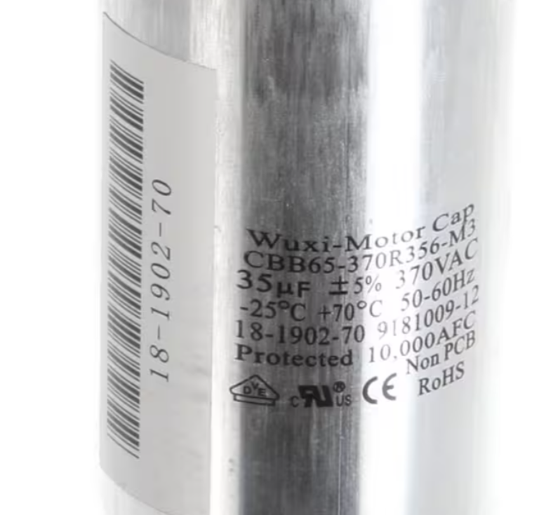 Ice O Matic CBB65-370R356-M3, 18-1902-70 Run Capacitor, 35uF, 370V, 50/60Hz is a genuine OEM motor run capacitor designed to ensure stable and efficient operation in Ice O Matic ice machine systems. With a capacitance of 35 microfarads (uF) and a 370V AC rating, this capacitor provides continuous power to motors and compressors, supporting reliable ice production. Built with a durable round metal housing and quick-connect terminals, it's engineered for fast installation and long-lasting performance in commercial environments.