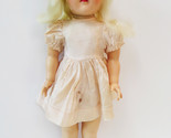16? hard plastic Ideal Toni doll from the 1950s. She is marked ?Ideal Doll/16? on her back and Ideal Doll/Made in U.S.A. on the back of her neck. Her eyes tend to sink into her head if she?s moved around. The irises have some discoloration in them. The hair on her wig is thin. Her dress looks original, but it has holes in it, mostly in the front skirt, but also one along a side seam. She has no shoes, socks, or panties. She has some dings and scratches to the paint on her face in three places, plus a paint rub on the tip of her nose. She has a crack along the seam of her head and a small crack on the back of her head near the neckline. She needs some fixing up, but can be nicely restored or she can be used for parts.