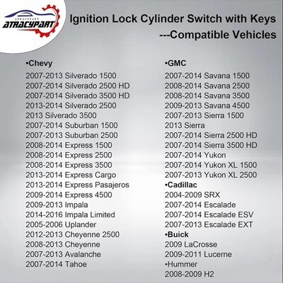 ?REPLACEMENT?The original ignition switch come on your vehicle experience motor wear over time, and that excessive wear will causes them to sticking and fail. This Chevy cylinder switch is the exact OEM design to replace your defective key cylinder. ?PREMIUM QUALITY?The Impala ignition cylinder has undergone a rigorous test to ensure high quality and better durability, strict quality control to ensure your vehicle's keys will be working like new. ?OE REPLACE#?924-796,19120038,15919460,15794826. You can put the original chip to the 1500 ignition switch key, making it easier to install in a plug-and-play manner, no cost for the new chip. ?REPLACEMENT FOR?07-14 Chevy Silverado 1500/2500/3500, 07-14 Suburban 1500/2500, 08-14 Express 1500/2500/3500/4500, 09-16 Impala, 05-06 Uplander, 08-13 Cheyenne, 07-13 Avalanche, 07-14 Tahoe. 07-14 GMC Savana 1500/2500/3500/4500, 07-14 Sierra 1500/2500/3500, 07-14 Yukon. 04-09 Cadillac SRX, 07-14 Escalade, 08-09 H2, 09 Buick LaCrosse, 09-11 Lucerne. ?24-MONTH WARRANTY? If for any reason at all, you are not fully satisfied with the Sierra ignition cylinder switch, you can contact us through amazon message for carefree REPLACEMENT or REFUND.