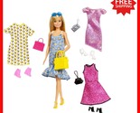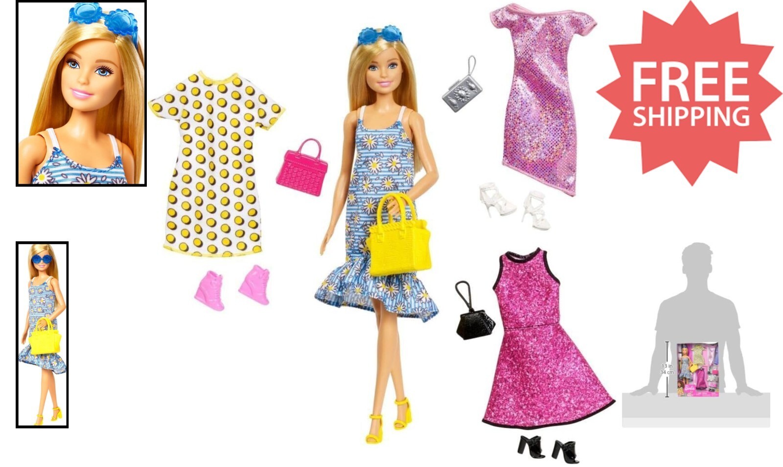 Unleash your child's imagination with the Barbie 3-piece outfit set, featuring a versatile Barbie doll and a collection of trendy clothes and accessories. This set includes four complete looks ? each with dresses, shoes, purses, and a pair of stylish sunglasses ? allowing kids to create countless storylines for any occasion. Crafted with vibrant fabrics, popular colors, and fun accessories, this set offers hours of imaginative play. Subject to availability. Colors, packaging, accessories, and decorations may vary.