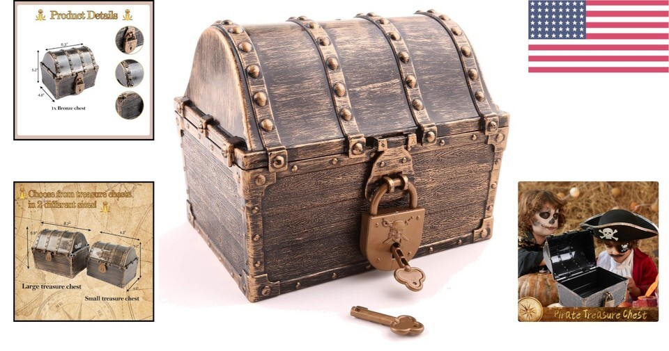 Unlock a world of adventure with this exquisite vintage bronze pirate treasure chest, designed for the little adventurers in your life. Perfectly sized at 6.3 inches 4.8 inches 5.2 inches, it's an enchanting treasure trove for your child's small collectibles.