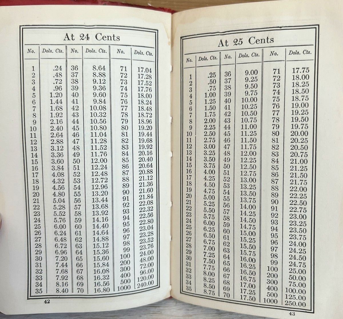 A ready reckoner is a printed book or table containing pre-calculated values, often multiples of given amounts. They were widely used in shops and by tradesmen before the advent of cheap electronic calculators, Metric weights and measures and Decimal currencies