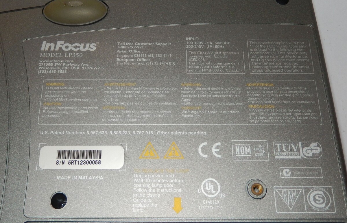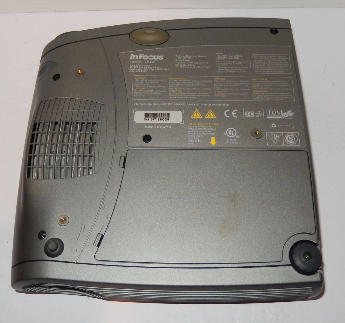 Model Information: InFocus, Model LP350. Serial Number: 5RT12300058.