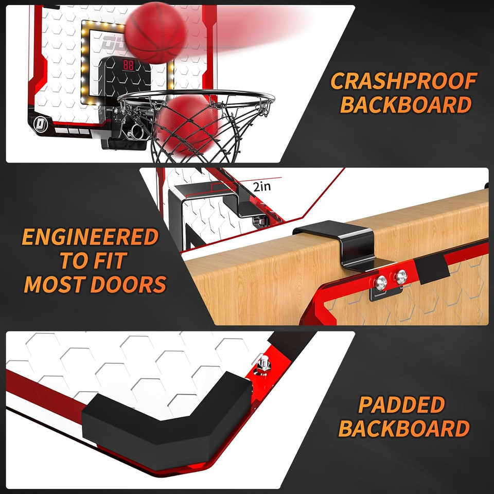 Mini Basketball Hoops - Our mini basketball hoop for door includes electronic scoreboard, 4 mini basketballs and a pump so that you can inflate and use right away. Comes with a clear manuals and all tools necessary, it has everything you need to play a game of indoor basketball.