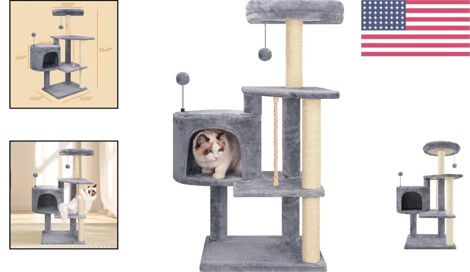 Multifunctional design serving as a climbing device, cozy cat condo, and play area.