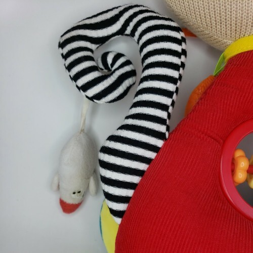 It has teethers, rattles, tags, an abacus, and a mirror, plus many different textures and sounds from handling