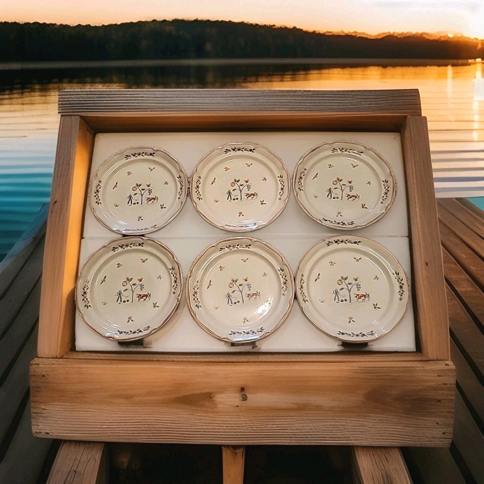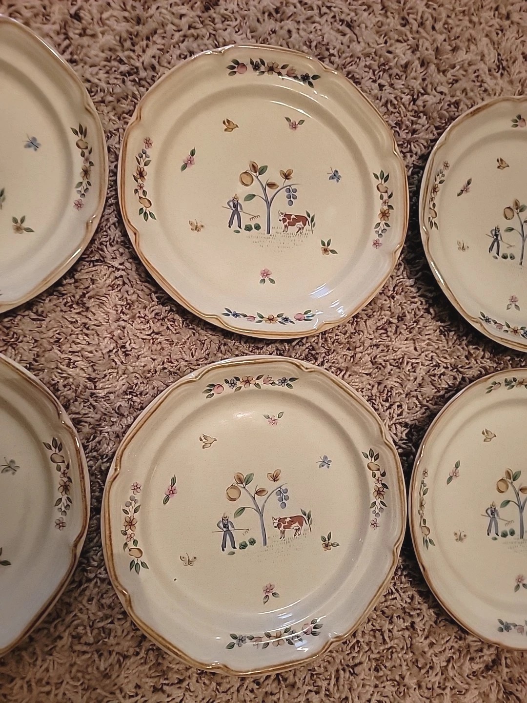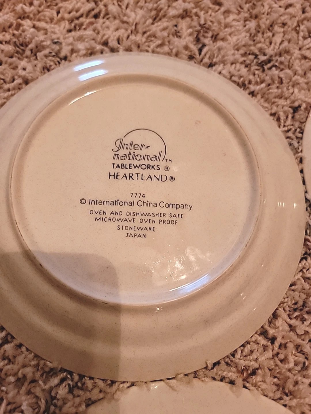 The International Heartland Stoneware 7 5/8" Salad Plate #7774 is a set of 6 vintage original salad plates featuring a Heartland pattern in a multi-color design. Made of stoneware in a round shape, these plates are perfect for all occasions and showcase an Americana and farm-themed style with Arts Crafts/Mission design elements. Manufactured in Japan during the 1980s by International Stoneware, this set includes a plate set and salad plates that are a charming addition to any table setting.