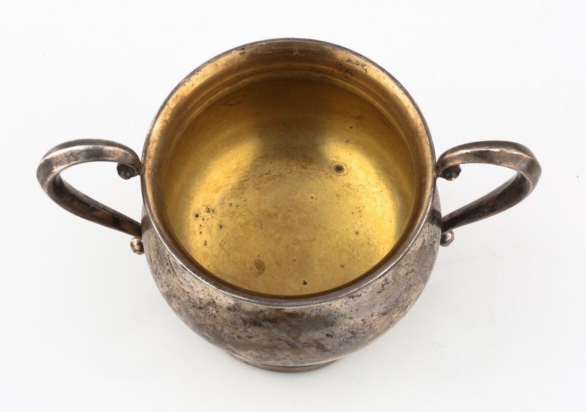 Condition: (sugar bowl) very good condition, dent to the base, very few surface scratches visible on the interior; (creamer) interior and exterior have visible surface scratches from repeated use