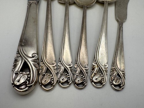 There are 1110 grams (35.69 troy ounces) of weighable sterling plus six hollow handle knives. They are in overall very good estate condition and are ready to use with a polish. One of the the cream soup spoons has a few dings on the bowl. They have no monograms.