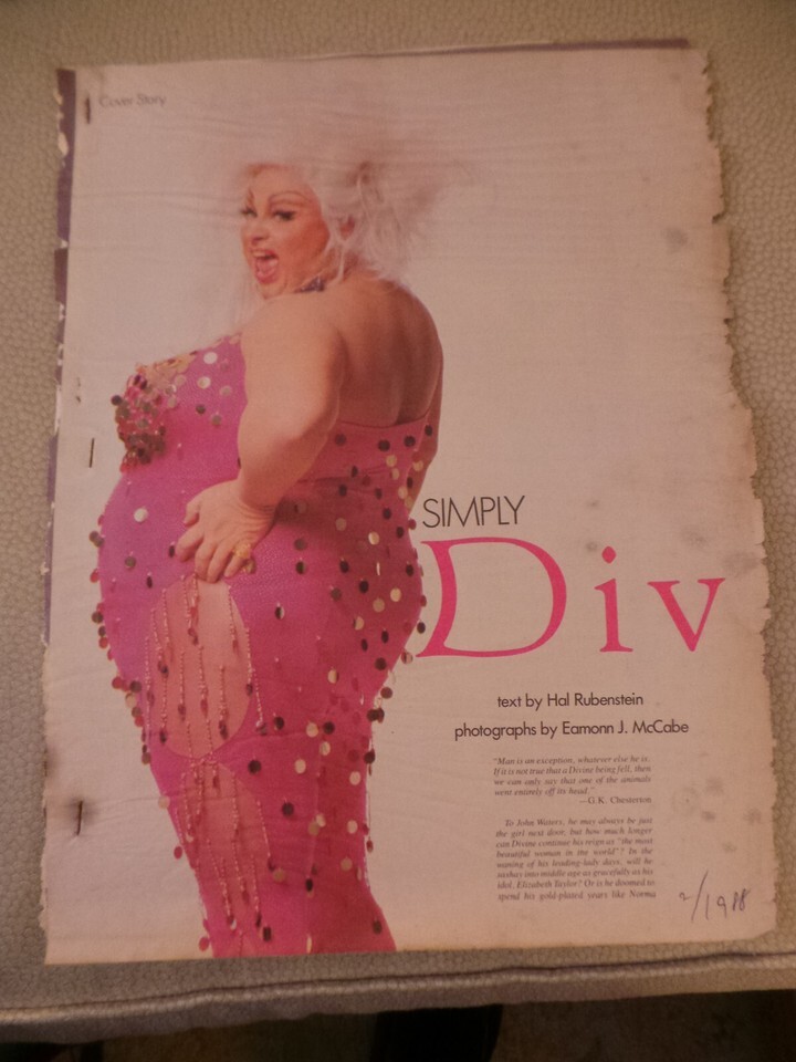 original Interview Magazine complete 7 page Divine article February 1988 obituary copy. was the cover story of the magazine. Divine passed away in early March 1988 soon after the magazine was printed.