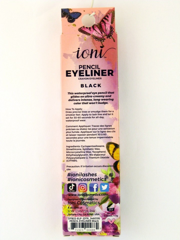of this Ioni Cosmetics Black crayon eyeliner. It is a waterproof eye pencil that glides on ultra-creamy. Has no Parabens, and is animal cruelty free. Use within 3 months of opening.