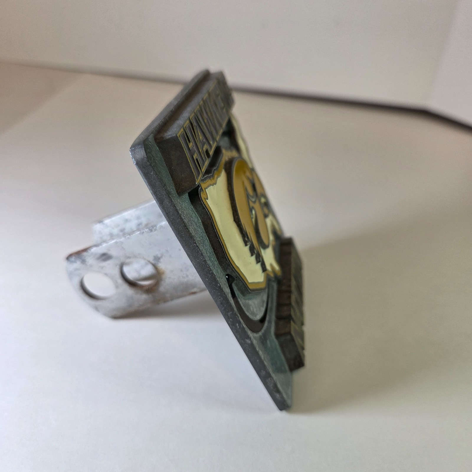 Show your team pride with this heavy-duty Iowa Hawkeye Nation trailer hitch cover. Features a bold raised design with the Hawkeye logo over a U.S. map silhouette. Pre-owned with wear and rusting to metal and hardware as shown?still a solid piece for any fan or collector.