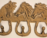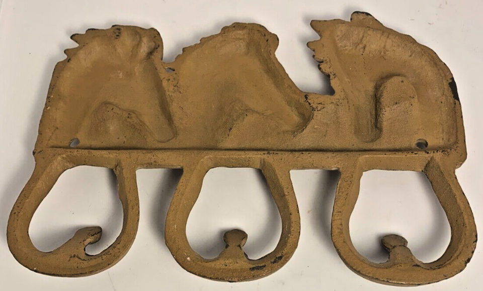 Add a touch of rustic charm to your home decor with this vintage cast iron towel hook rack featuring three horse head hooks on horseshoe background mount.