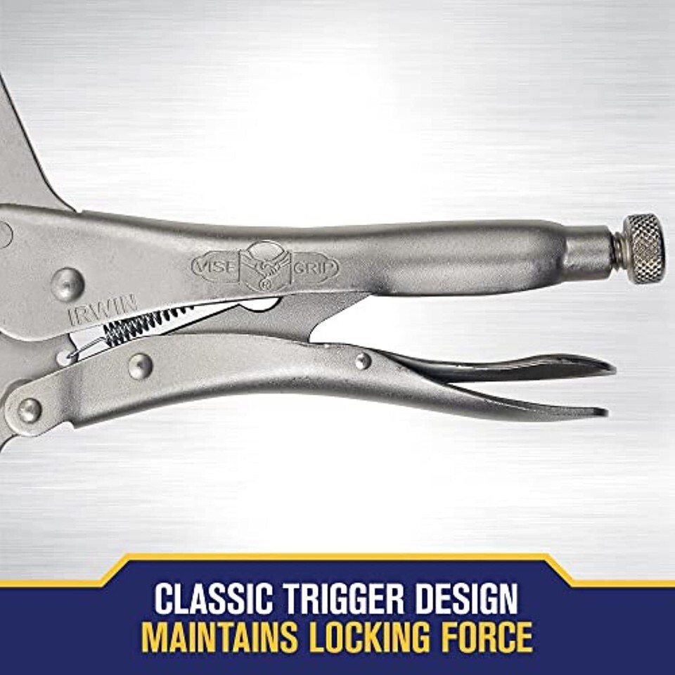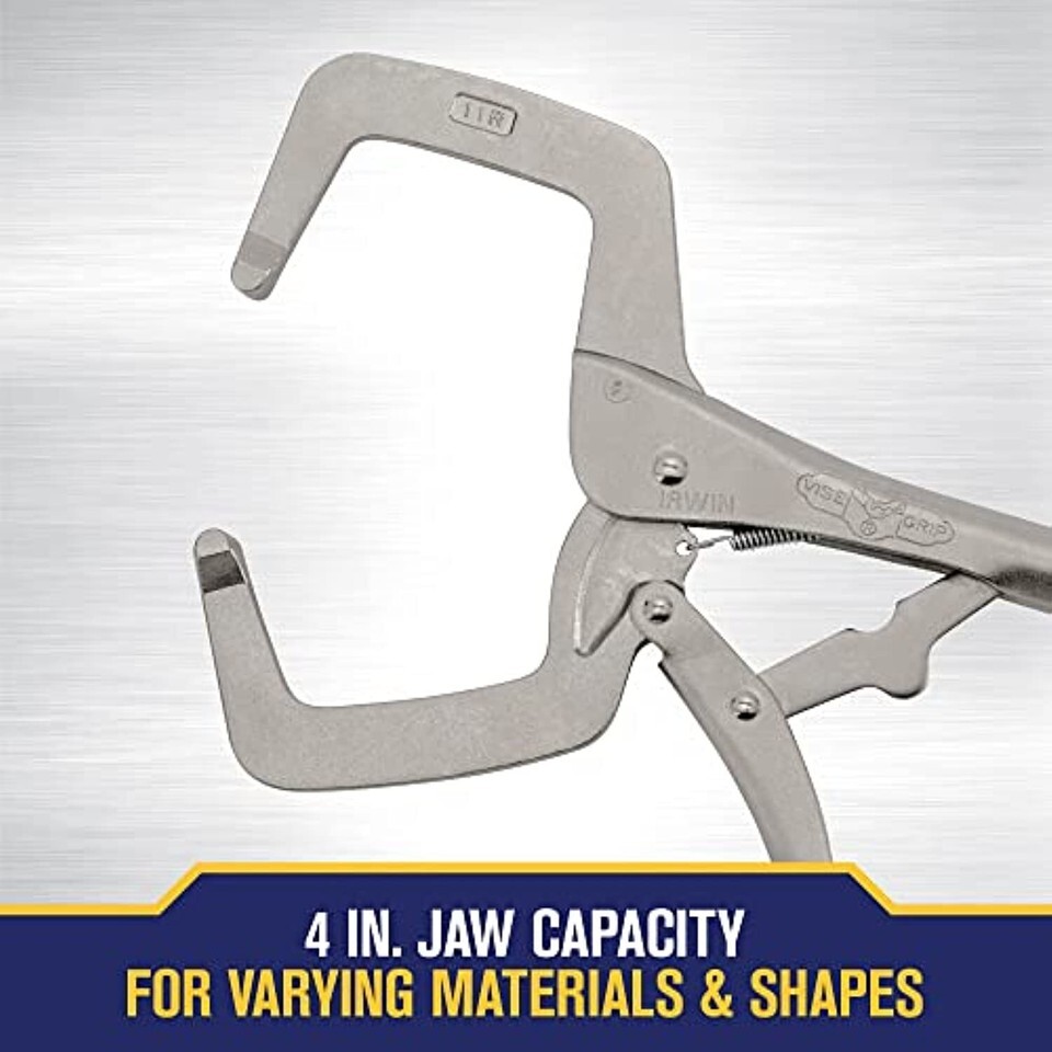 Product Description The IRWIN VISE-GRIP Original Locking C-Clamp features 4"-wide opening jaws for more versatility and the ability to clamp a variety of shapes with just one tool. Pressure and fit can be adjusted with the turn screw that stays adjusted for repetitive use. Constructed of high-grade, heat-treated alloy steel for maximum toughness and durability, the Original C-Clamp has the classic trigger release design that maintains maximum locking force where you need it.. From the Manufacturer C Clamp With Regular Tips, measures 11 inches, with a jaw adjustment of up to 4 inches, and a throat depth of 2-5/8 inches, easily adjusts to correct opening, locks with one hand, and made of high-grade alloy steel heat treated for maximum toughness and durability. Irwin tools are made of only the finest materials, manufactured to exacting tolerances.