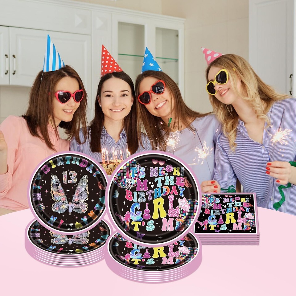 Package includes: you will receive 72pcs Iridescent girl birthday decorations tableware set includes 24pcs 9-inch its me hi im the birthday girl its me plates, 24pcs 7-inch Iridescent girl plates, 24pcs its me hi im the birthday girl its me napkins, each set can serve 24 guests.this set of girl plates and napkins party supplies set will add amazing to you, your family and friends