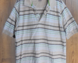 Description: Very nice golf polo shirt. Classic. Three button neckline. Logo on sleeve. Side slits. Stretchy. Multicolored stripes. Tan collar and cuffs.