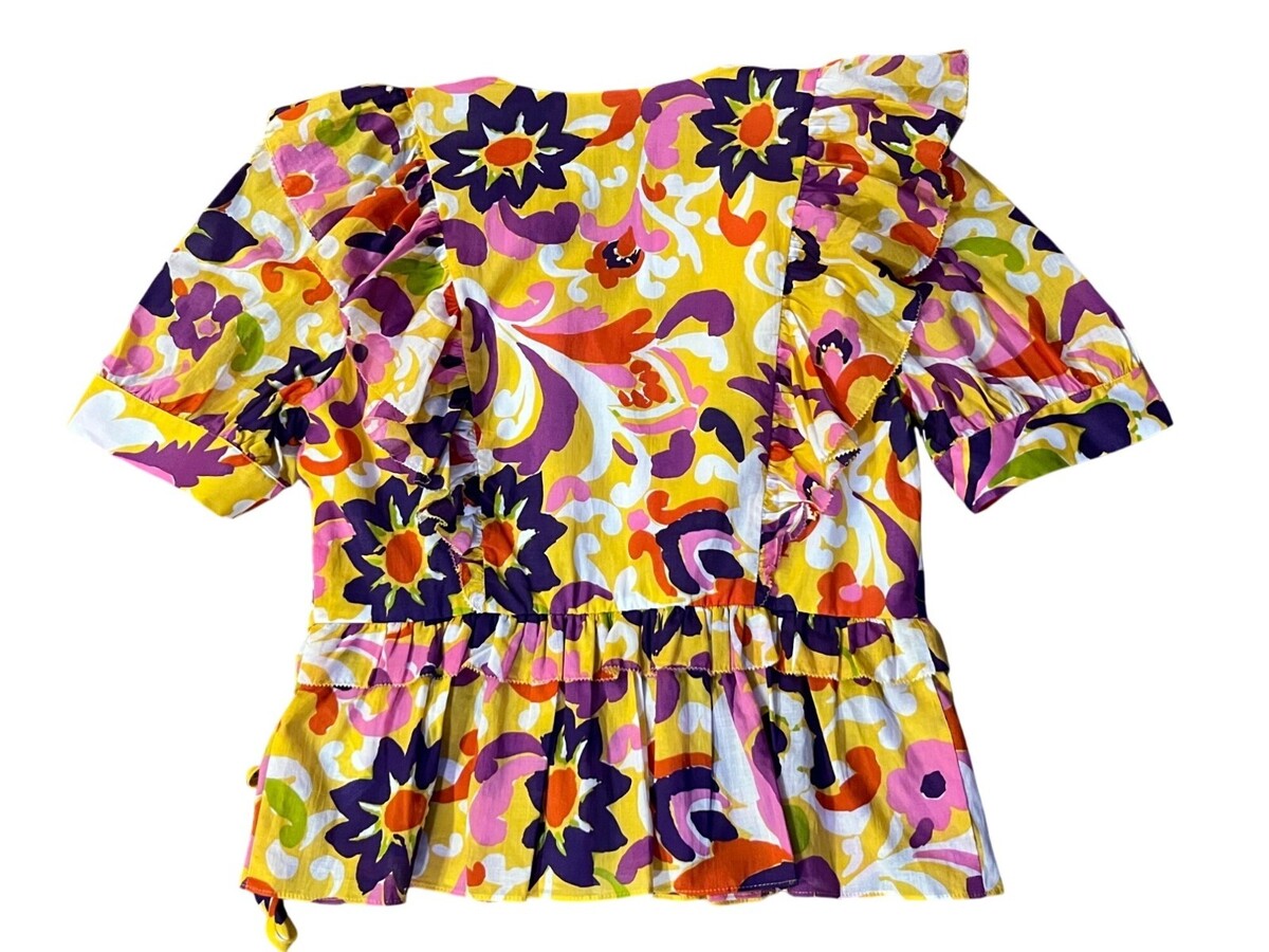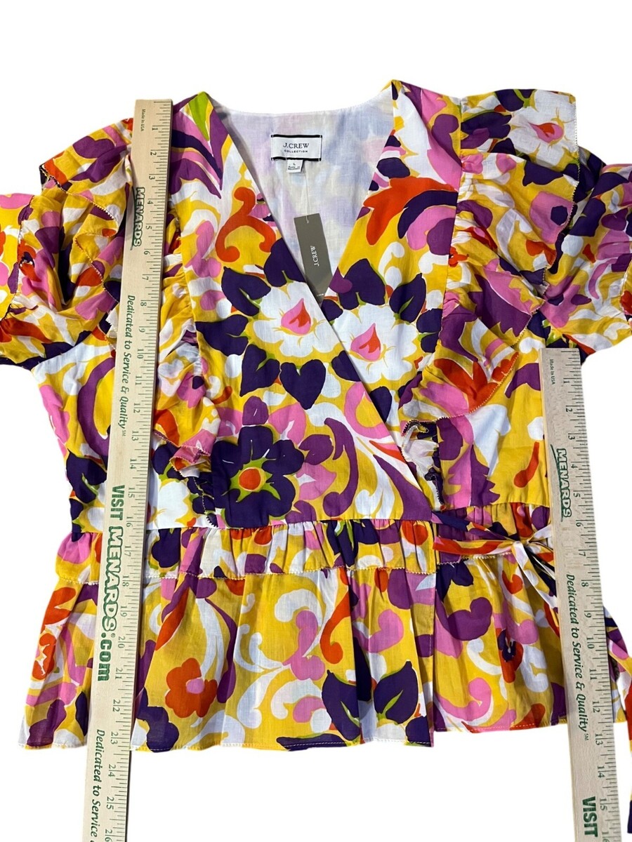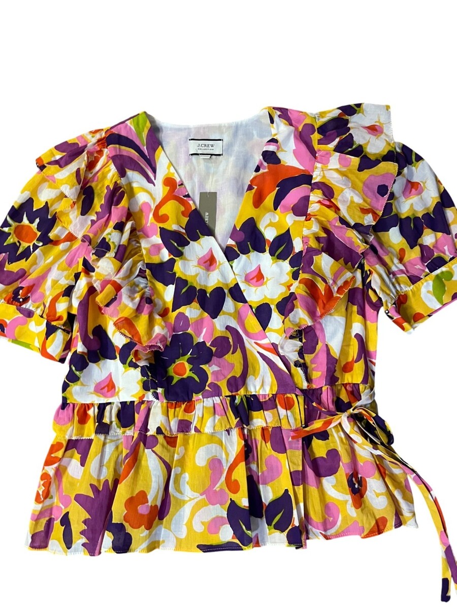 J.Crew, J.Crew Collection, Ratti, floral blouse, wrap top, ruffle blouse, cotton blouse, women?s top, size L, new with tags, NWT, printed blouse, Italian print, spring top, summer blouse, boho style, J Crew AW532, colorful blouse, short sleeve blouse, peplum blouse, tie waist top, feminine blouse, statement top, vacation wear, resort wear, floral fashion, designer blouse, breathable cotton, gift for her