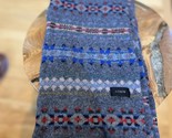 Soft wool scarf featuring a classic Fairisle pattern in shades of gray, blue, red, and cream.