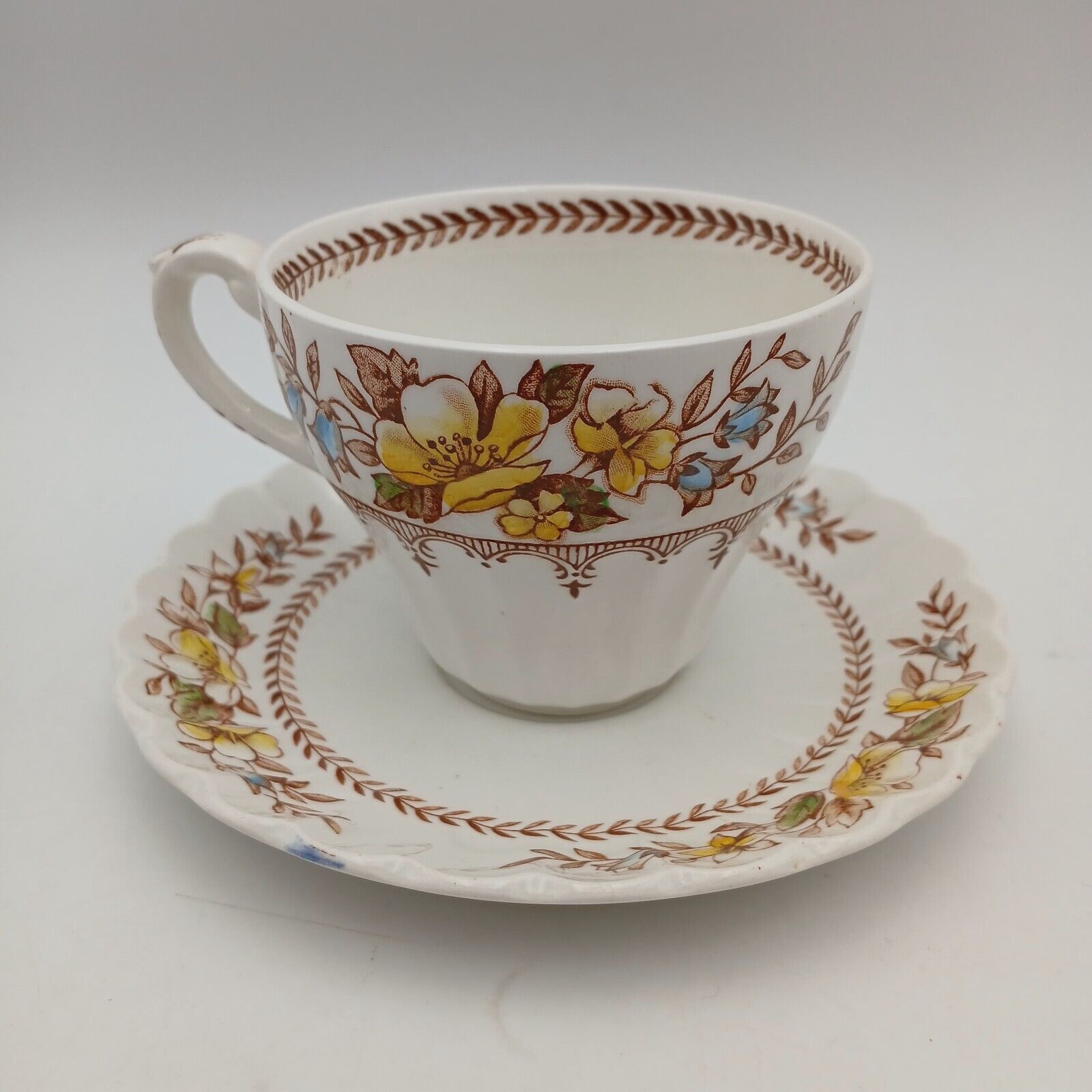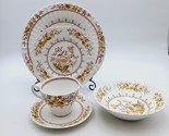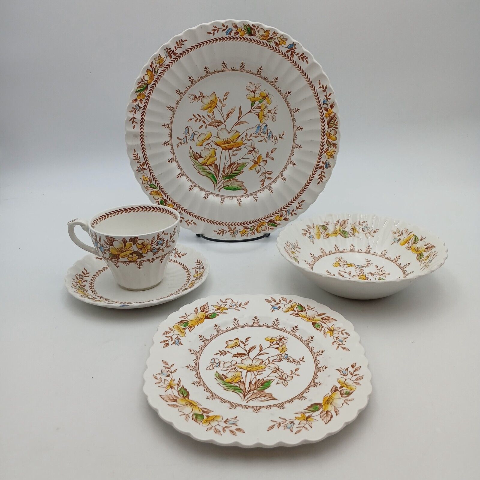 The set includes a sauce plate, dessert plate, soup bowl, dinner plate, and cup, all of which are vintage and made in the United Kingdom. The production style of the set is flowers, making it a perfect addition to any decorative cookware, dinnerware, and serveware collection. This set is sure to impress your guests and elevate your dining experience.