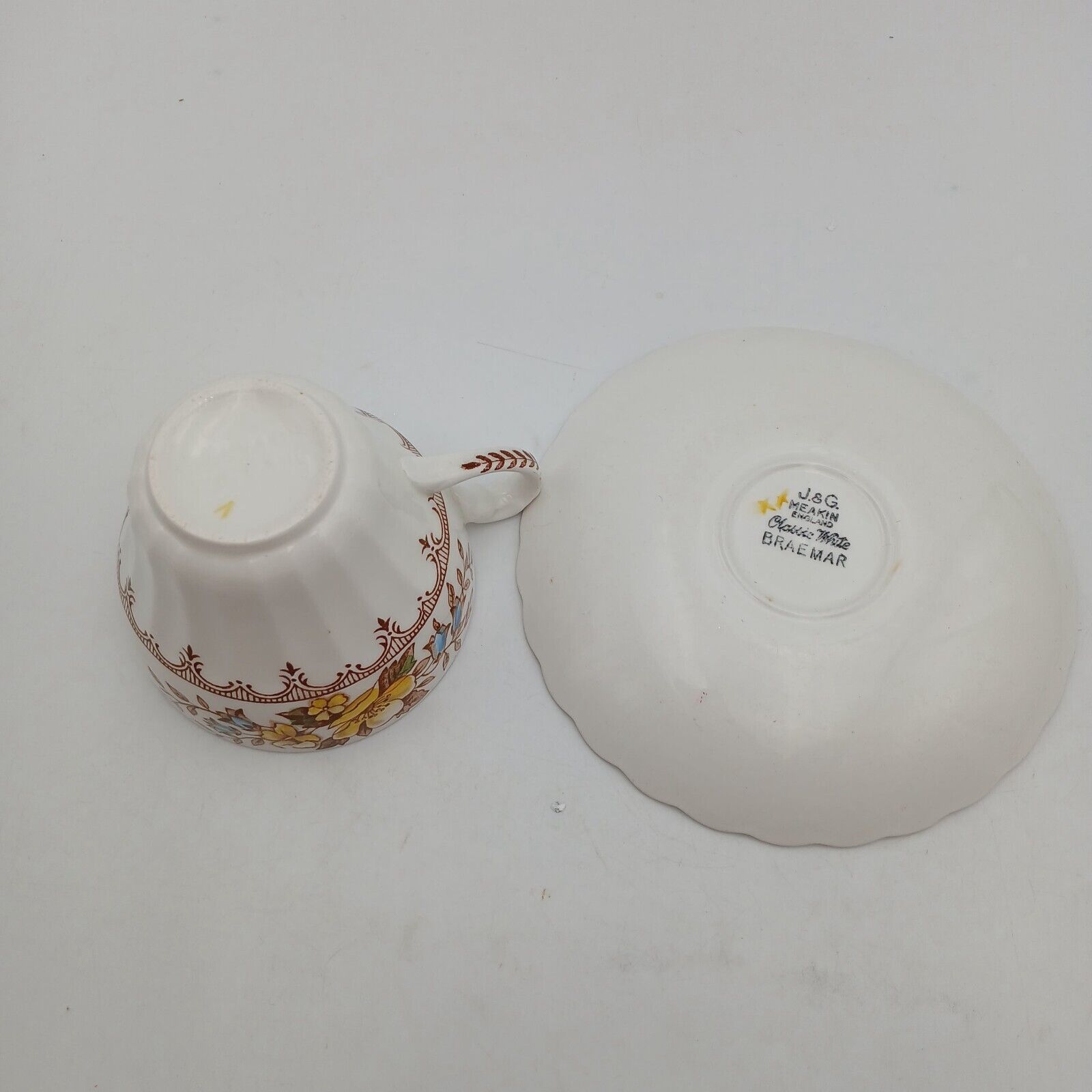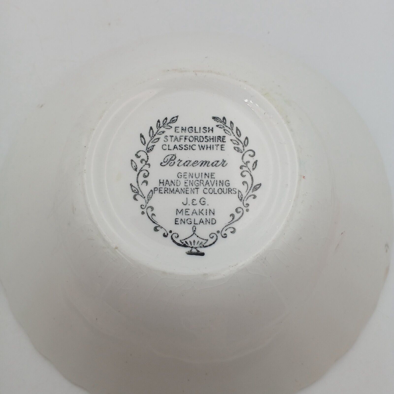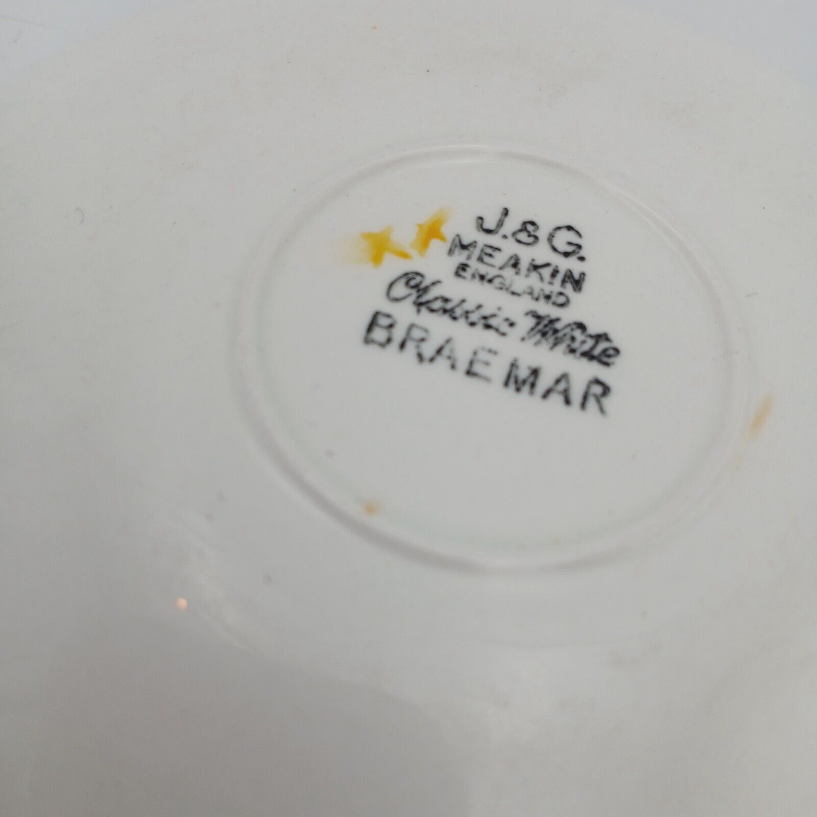 This exquisite set of J G Meakin England English Staffordshire Braemar is a must-have for any fine dinnerware collection. The set includes five pieces, featuring a delicate floral pattern on a white background. The pieces are made of high-quality porcelain, bone china, China, and ceramic, ensuring durability and long-lasting use.