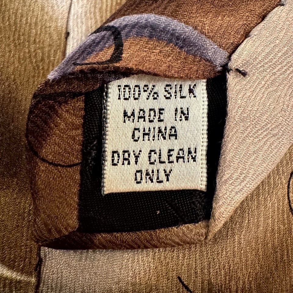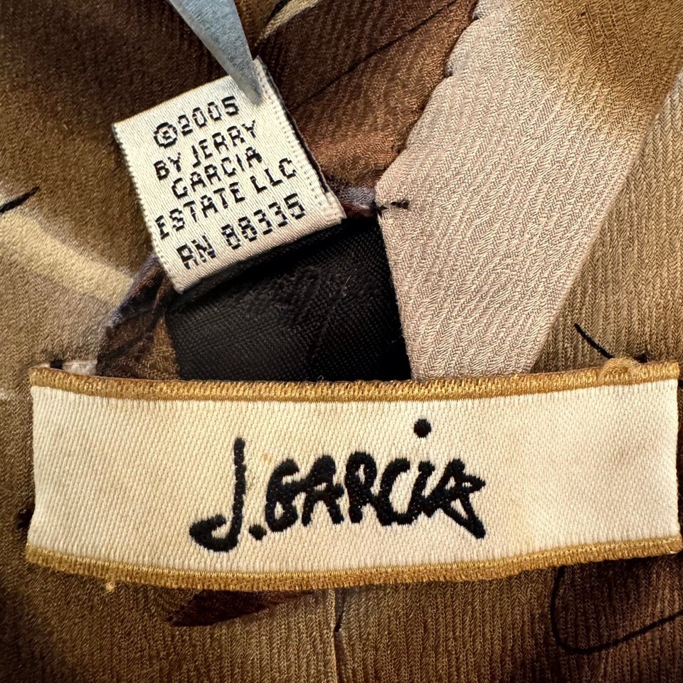 Vibrant J. Garcia silk tie featuring an abstract swirl art design in warm brown and gold tones. From the official Jerry Garcia Estate line, copyright 2005. Smooth 100% silk with a rich sheen and great drape.