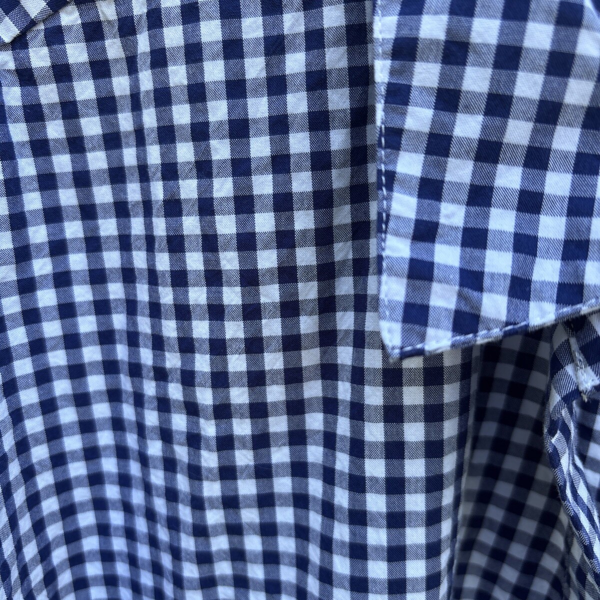 Blue gingham check. Looks good pressed or left to hang dry and wear