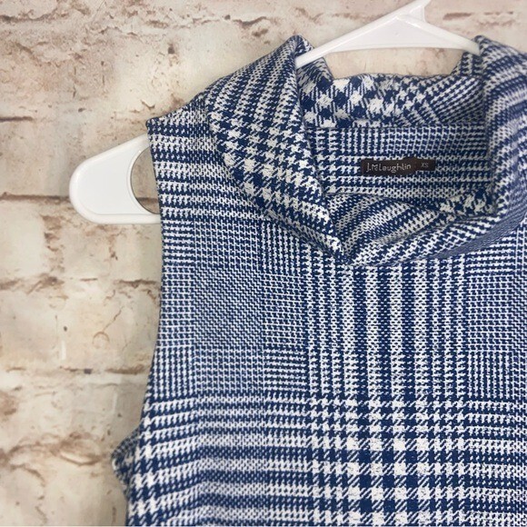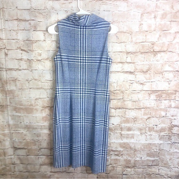 J McLaughlin Cowl Neck Sheath Dress in Blue/White Glen Plaid Size XS / 78 Rayon 14 Nylon 8 Spandex/ sleeveless, cowl neck