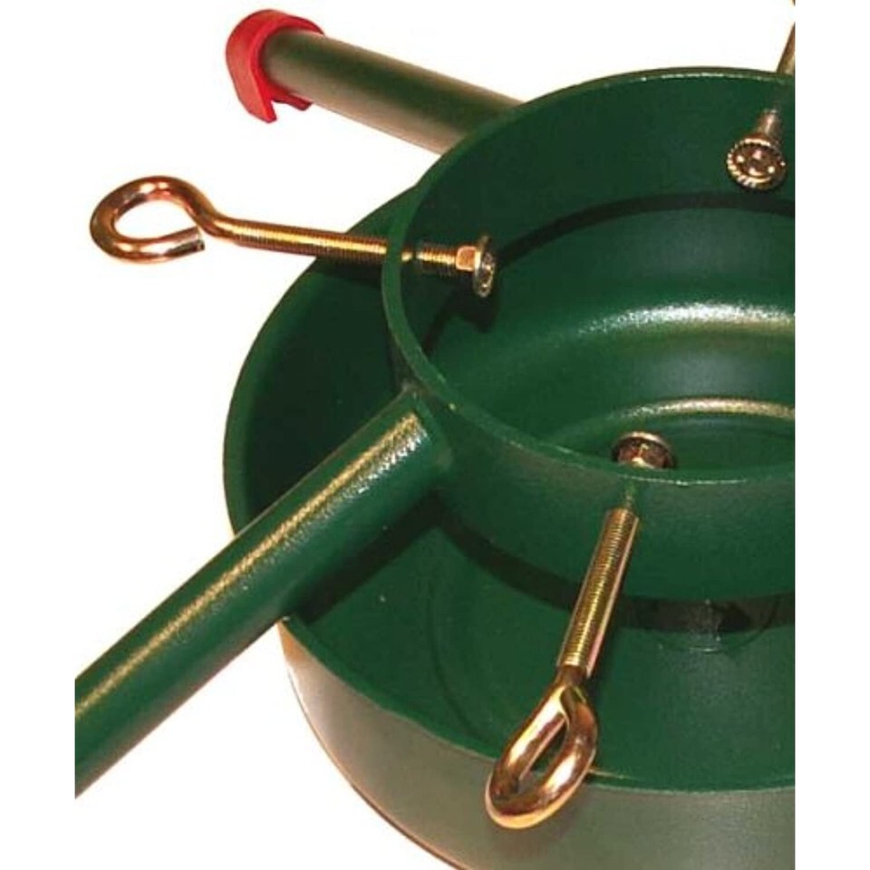 4 eye-bolts hold tree trunk securely. Steel spike base for stability. Tubular steel legs will not flex under the load of heavy trees. Corrosion-resistant 'gold tone' zinc-dichromate hardware.