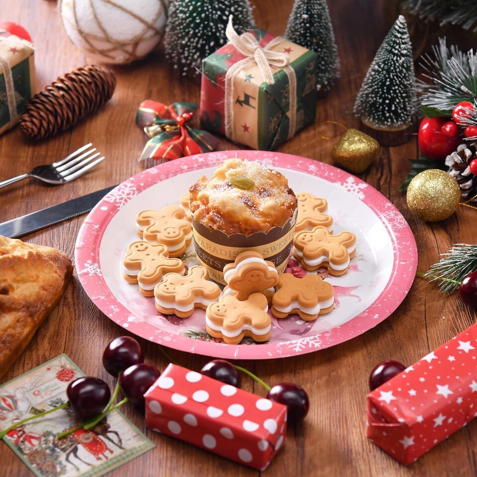 The disposable plates Christmas are made of thick paper material, which is very thick and durable. Christmas paper dessert plates can be used to hold chips, cakes, burritos, candies, hamburgers, salads, sandwiches, sushi and other foods at Christmas parties, birthday parties, barbecues, family dinners.