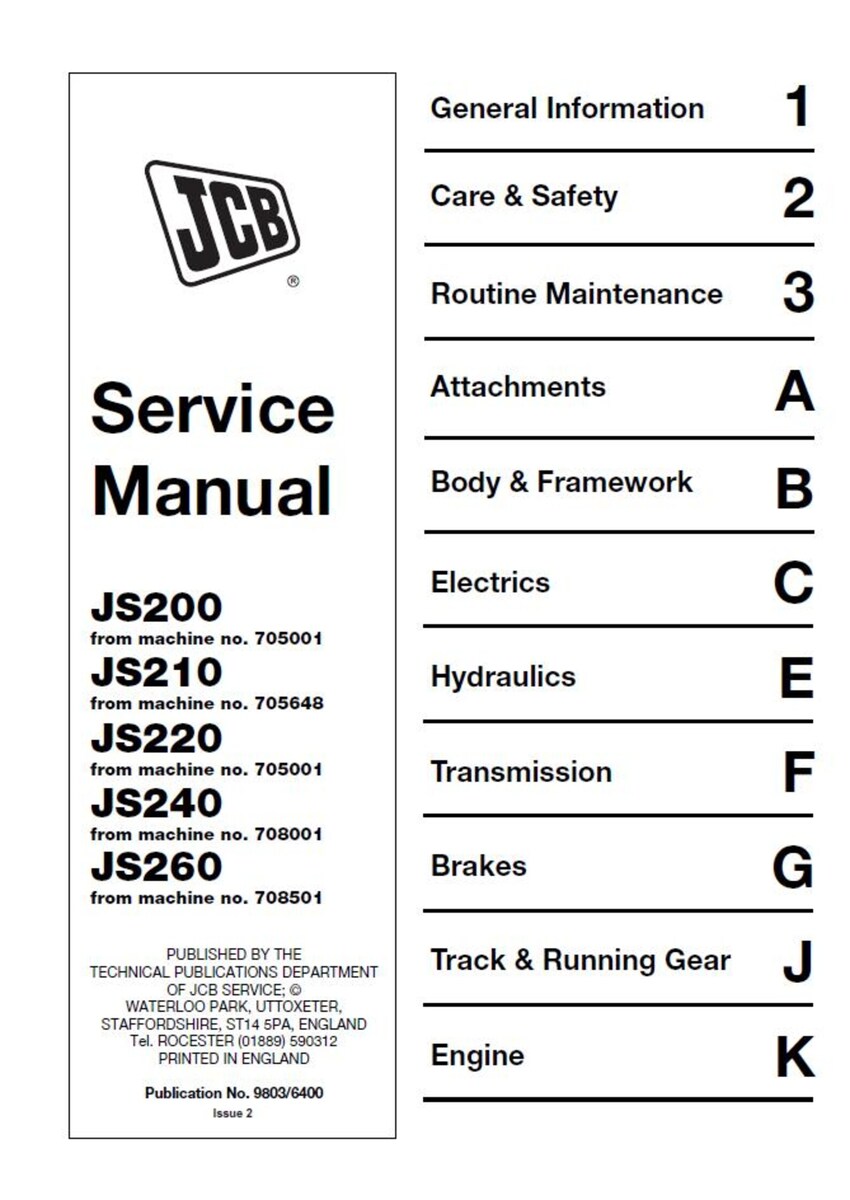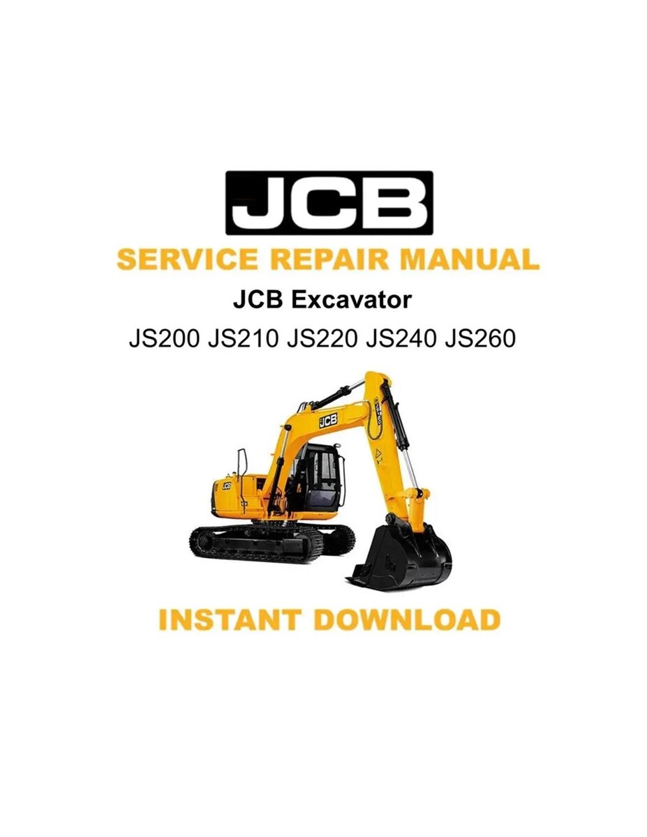 This manual is a service repair workshop manual for the JCB JS200 JS210 JS220 JS240 JS260 Excavator. This service manual is the most up to date version. This manual would be used by a technician at a shop.