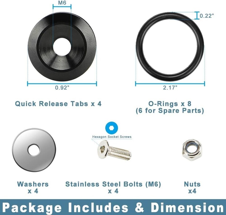 Items Included: Bolts,Quick release tabs,Stainless steel bolts (M6),Nuts,Washers,O-Rings