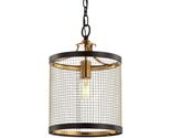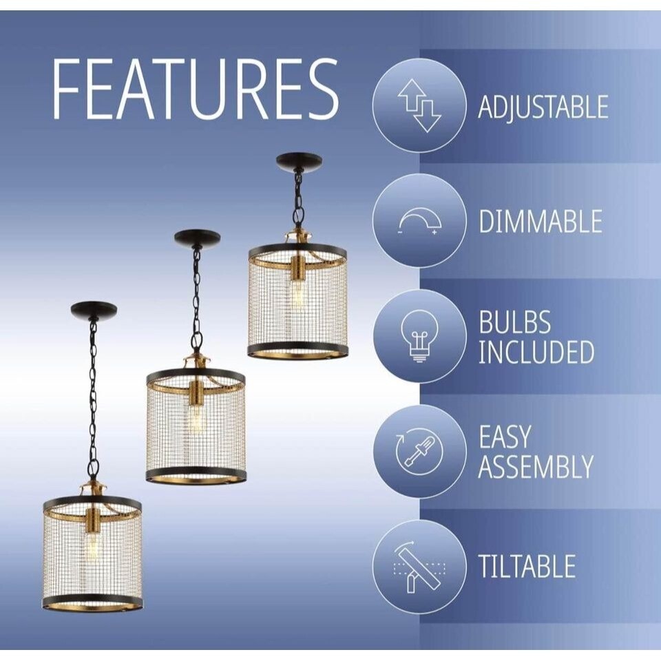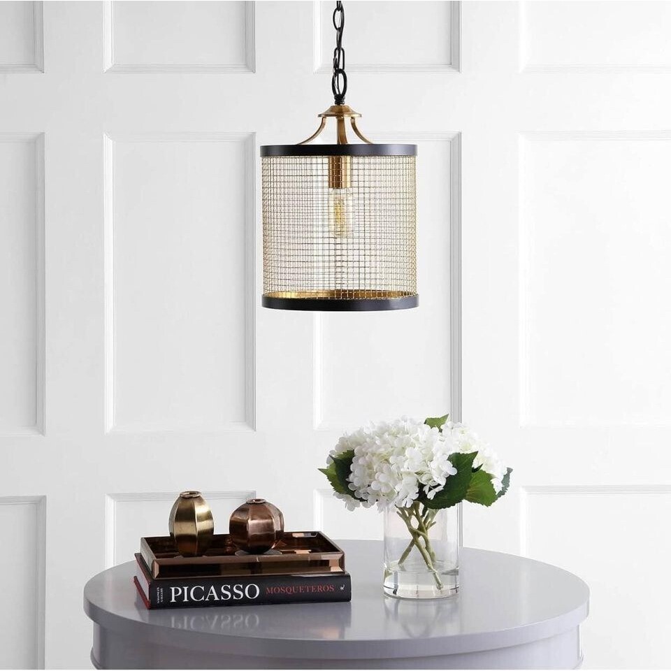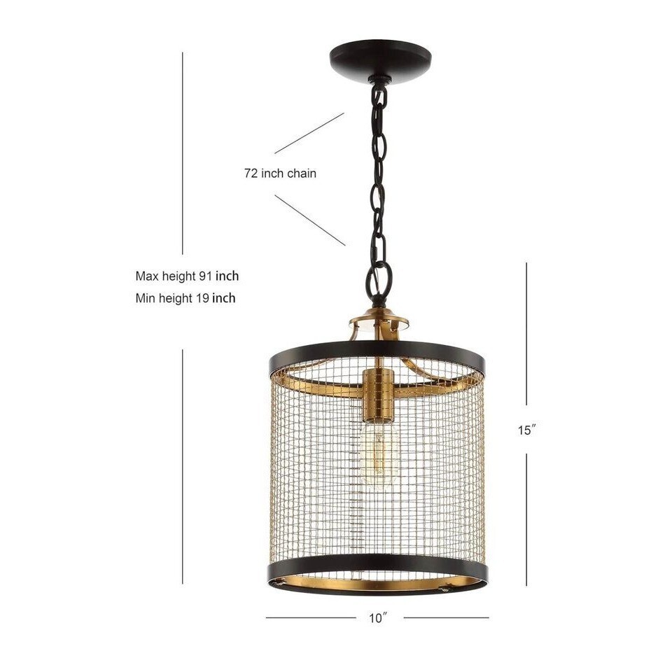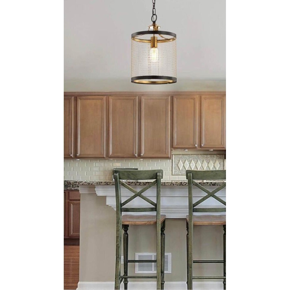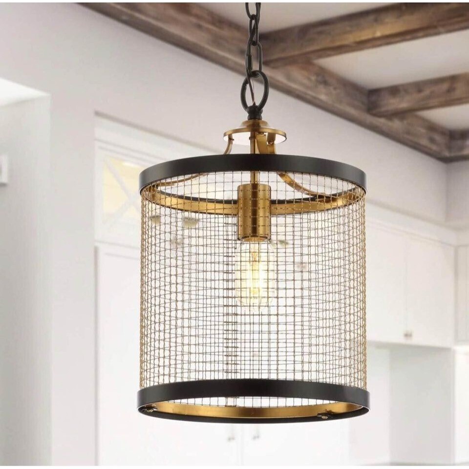 A brass grid surrounds and softens the light from a single bulb in this stylish pendant. With black exterior rings, the reflection of the light on the golden interior creates a warm glow, while the sturdy construction makes it a work horse for any high traffic space. Best of all, the drop is adjustable so it can be altered to suit any ceiling height