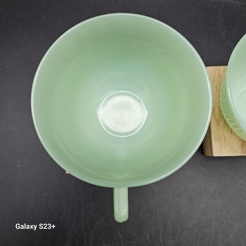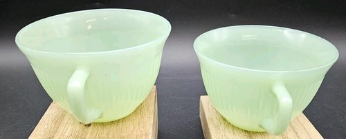 - Jadeite Jane Ray Tea Cup Vintage Fire King Oven Ware Green Glass 2 Coffee Mugs