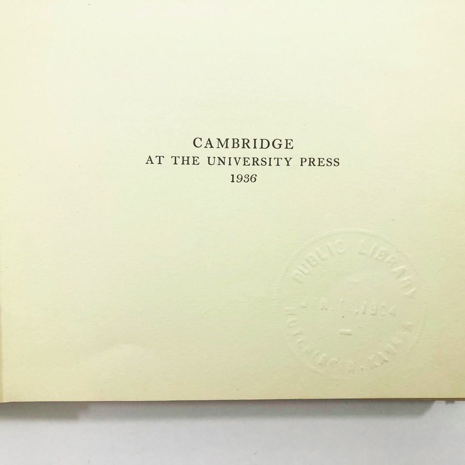 Printed in London by Cambridge University Press in 1936. This is a library edition from the Hutchinson Kansas (best guess from the stamp inside). Some scuff marks on the edges corners, some separation of the pages from the binding in the front section of the book. Also some discoloration of the pages due to age and some notes inside from various readers.